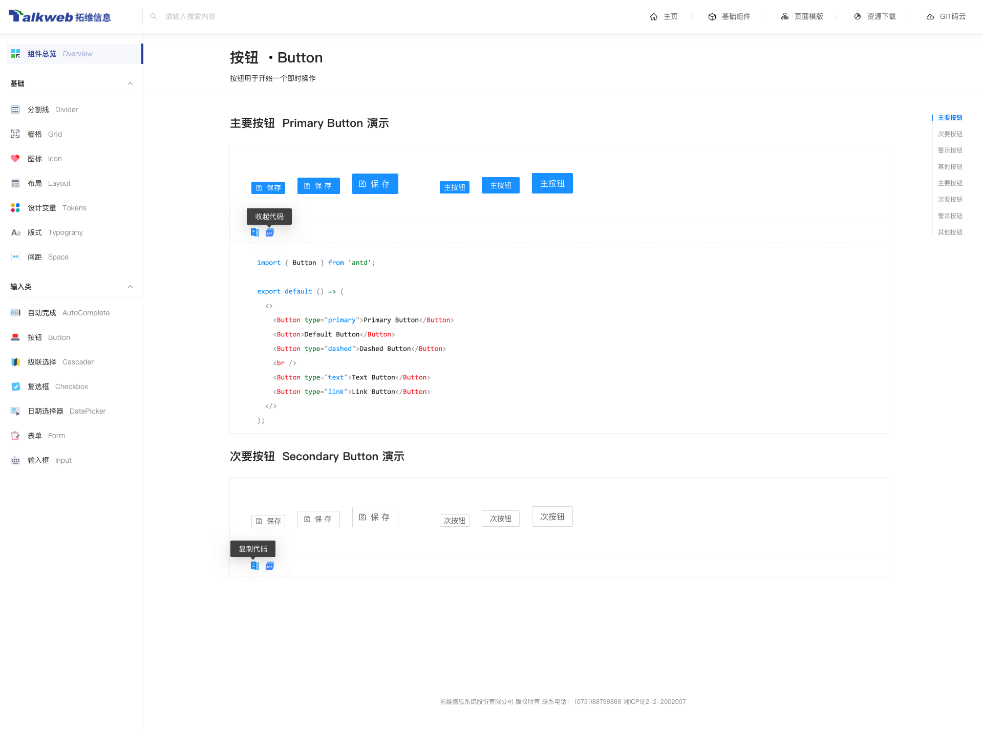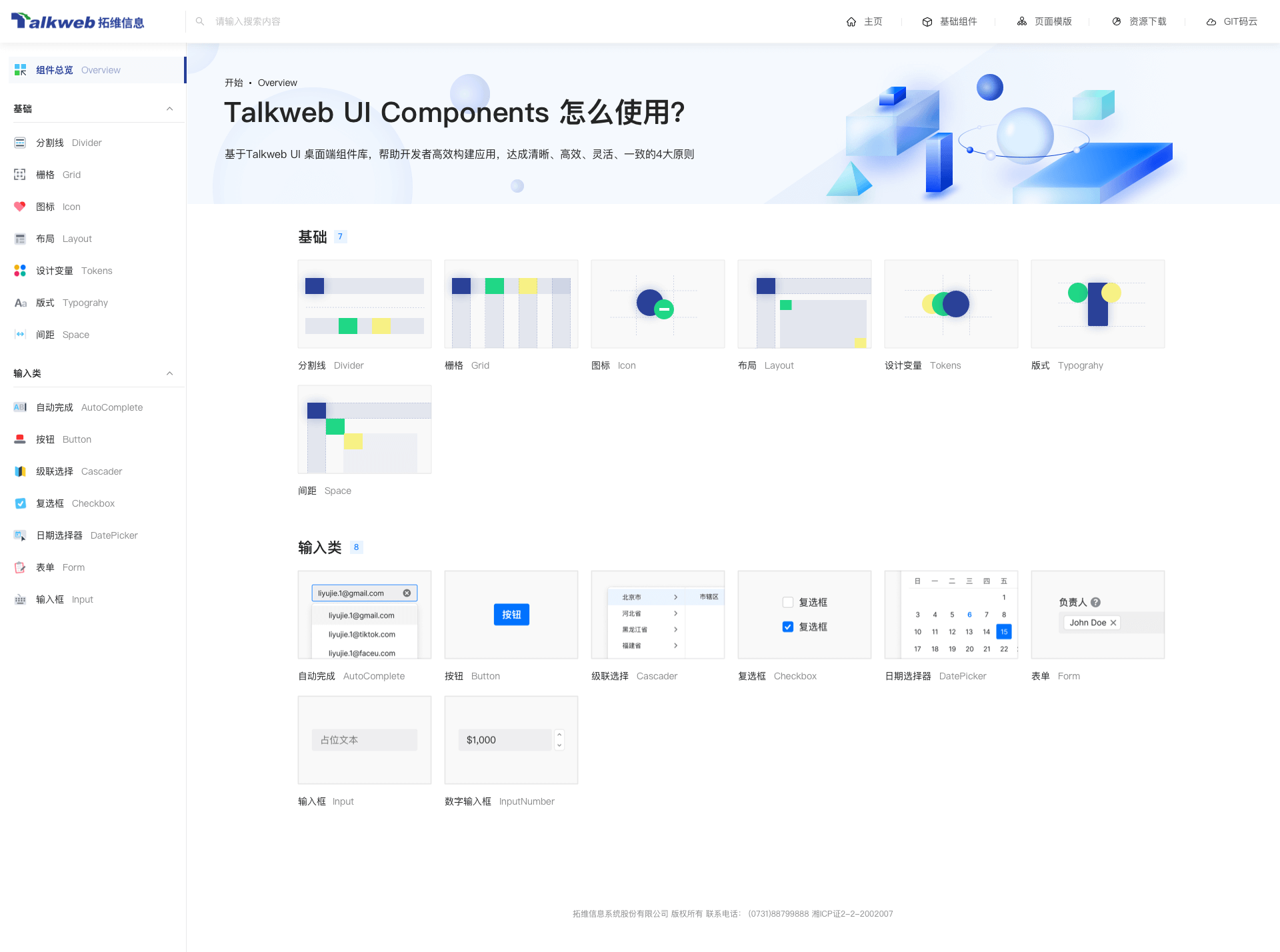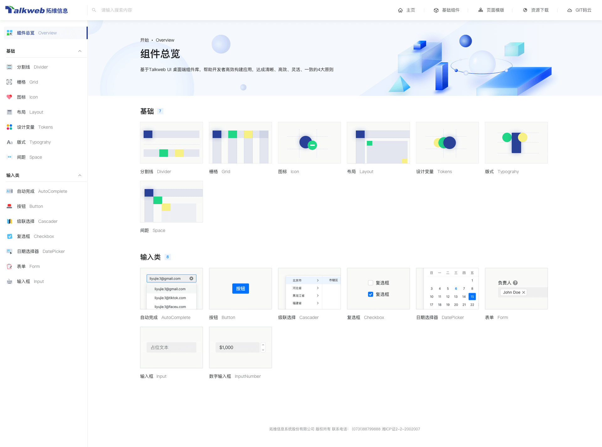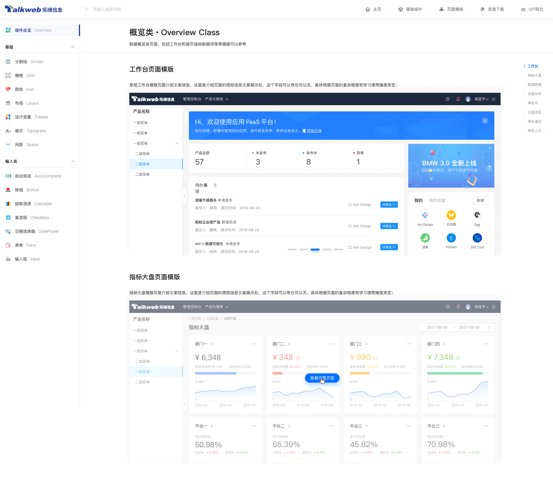 原子化组件构建:从色彩、字体、间距等设计变量出发,组合成基础组件(按钮、输入框等),再拼装为业务模块和页面模板,确保复用性和可维护性。 规范化的栅格系统:采用12/24栅格布局,配合间距变量,保证页面排版秩序井然。 状态与反馈完整:每个组件都定义正常、悬停、点击、禁用等状态,配合提示信息,增强操作感知。 场景化模板沉淀:提炼工作台、指标大盘等高频业务页面为模板,附带示例数据,让开发者可直接复用或修改。 代码与设计同步:提供代码片段和设计资源下载,打通设计与开发链路,减少沟通偏差。TalkwebUI 设计系统 · 从原子到页面