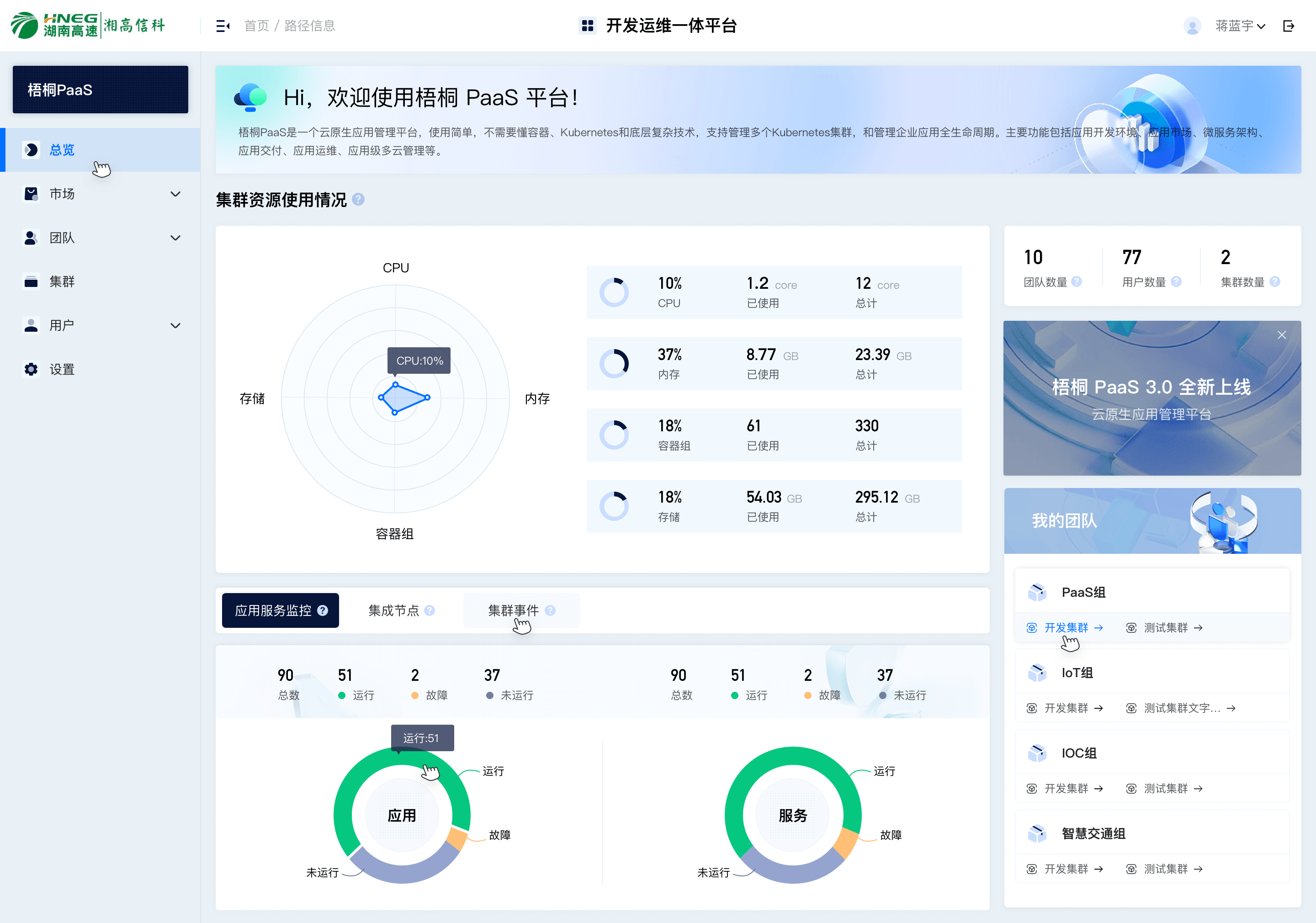 | 总览仪表盘 | 集群资源(CPU/内存/存储)与团队应用健康度一屏呈现,多维度状态可视化 |
