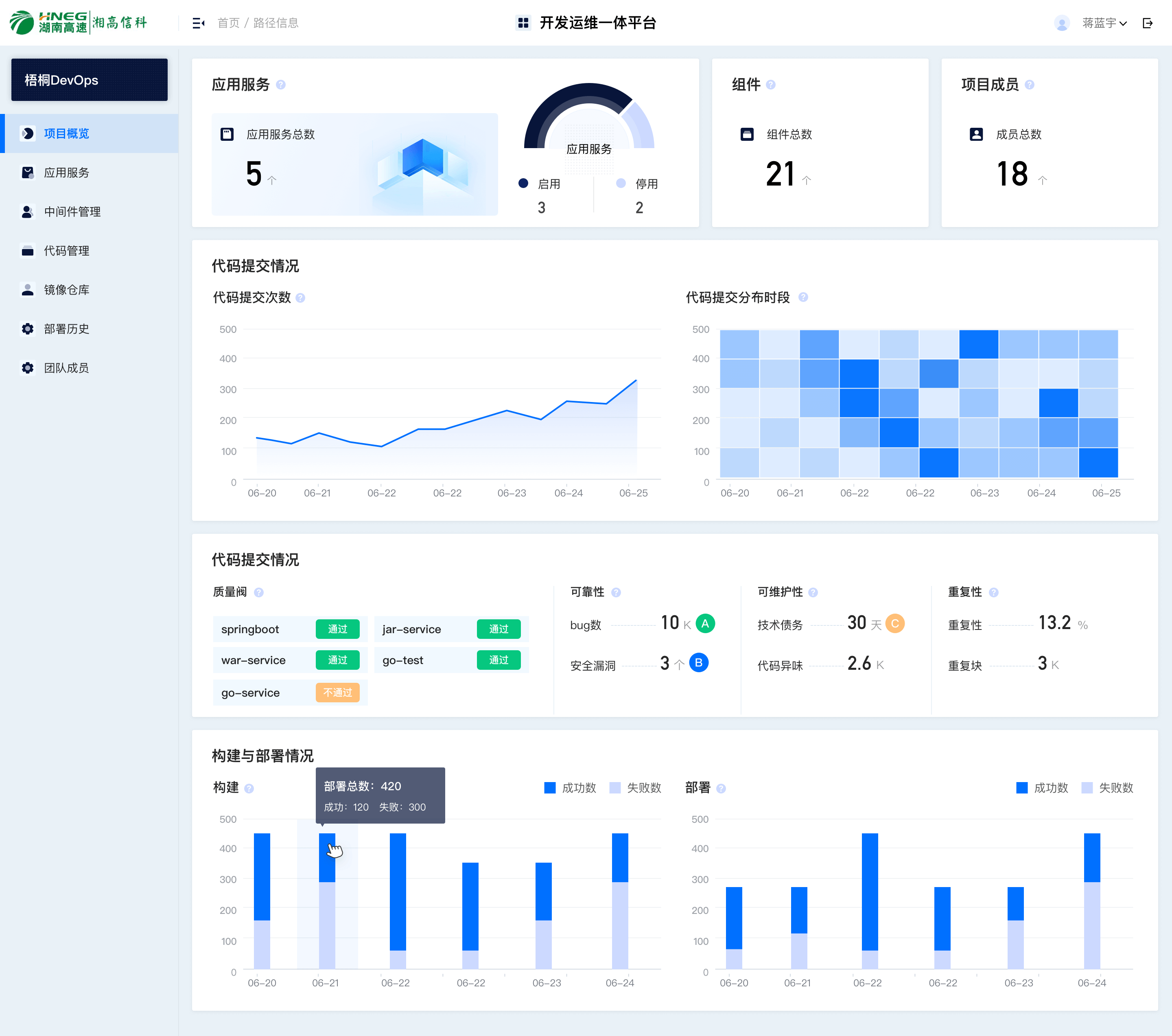 | 代码提交与构建部署 | 图表结合质量阀状态,直观呈现研发效能与代码健康度 |