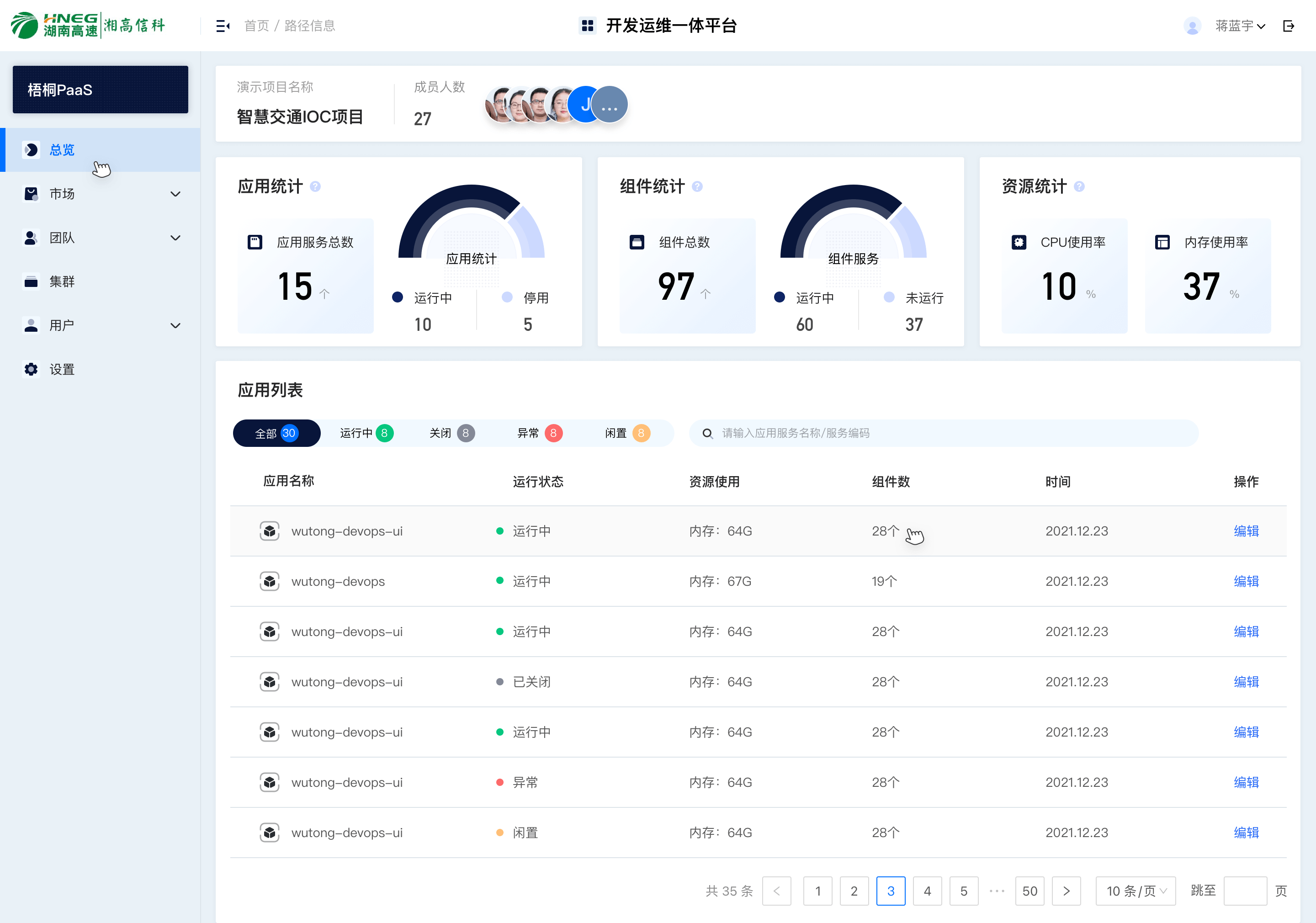 | 应用列表 | 按状态(运行中/关闭/异常/闲置)筛选,资源使用率、组件数量等关键指标,提升运维定位效率 |